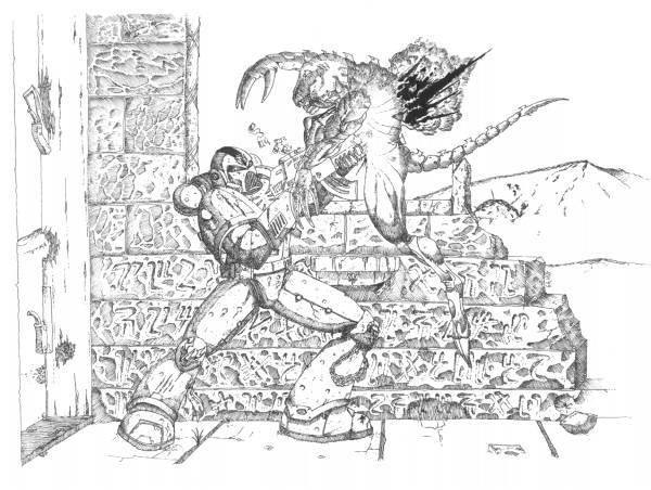 | Marine: | un Marine Espacial del Warhammer 40k. Estilógrafo del 0.2 sobre lámina de dibujo en tinta DinA4. |